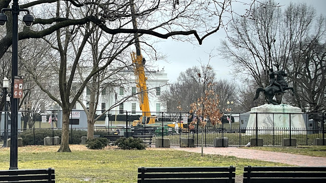 The guy that does the 'man about town' videos in DC posted a still photo. Says 'The press viewing stand across from the White House is no more. A giant crane is clearing things up as you read this'.