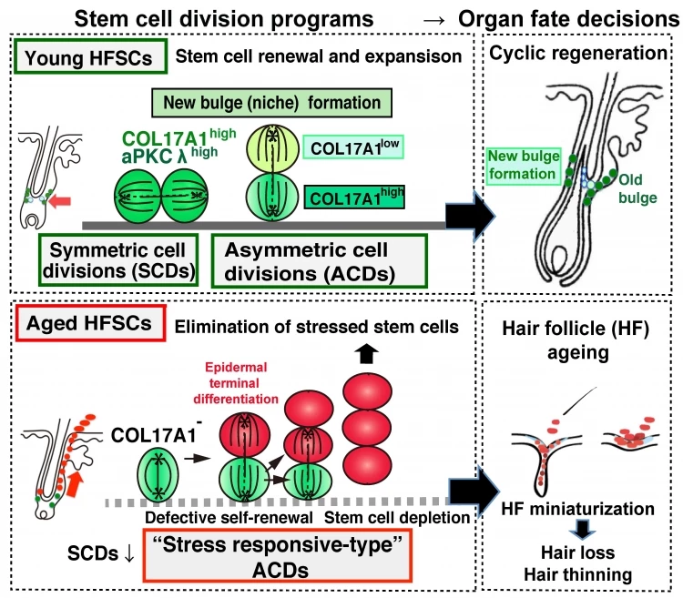 A schematic depicting the newly uncovered mechanism that can lead to hair loss, resulting from a breakdown in the healthy division of hair follicle stem cellsTokyo Medical and Dental University The upshot of this was that the hair follicle stem cells became exhausted as they aged, leading them to be cleared away from the body. In turn, this led to the thinning and loss of the hair follicles over time.