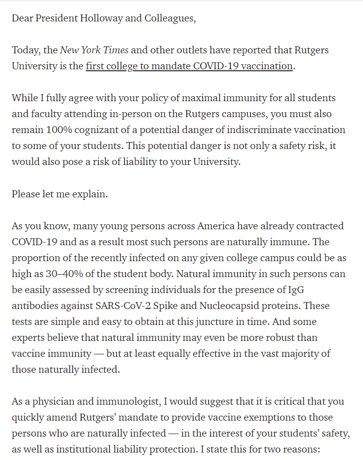 Interesting letter from the Immunologist that was on Tucker Carlson the other night warning Rutgers not to follow through on their plan to insist that all students be vaccinated.