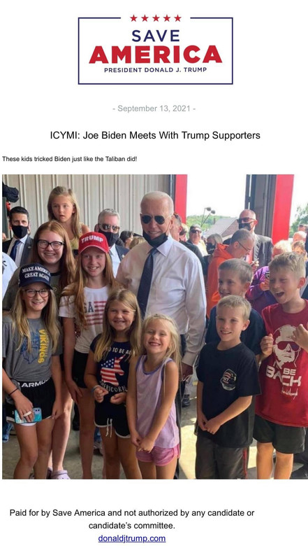 ROFL! He was so excited to see kids he didn’t notice what they were wearing. Hilarious! I wonder if Trump has commented on it.