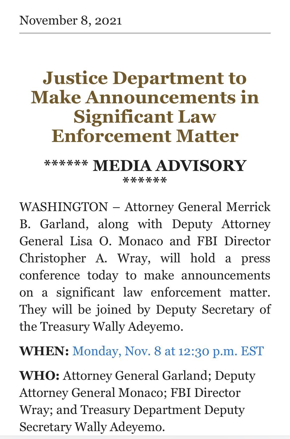 BREAKING: Justice department to make announcements in “Significant Law Enforcement Matter” soon.