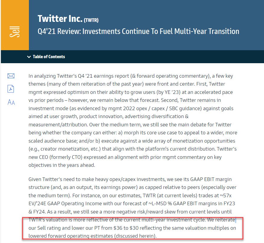 Well this is awkward: TWTR board hired Goldman to "advise" it that the @elonmusk $54.20 offer is too low. Only problem: Goldman has a SELL rating with a $30 price target. Oops.