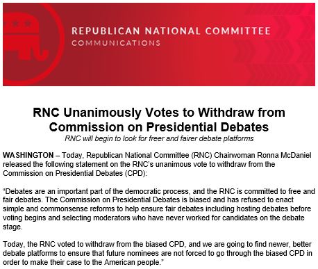 Today, the RNC voted to withdraw from the biased CPD, and we are going to find newer, better debate platforms to ensure that future nominees are not forced to go through the biased CPD in order to make their case to the American people.