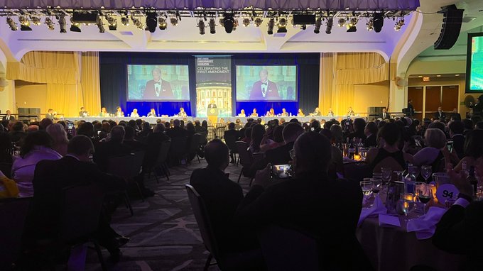 Biden notes that this is the first time a president has attended the WHCA dinner in six years. "We had a horrible plague followed by two years of COVID."