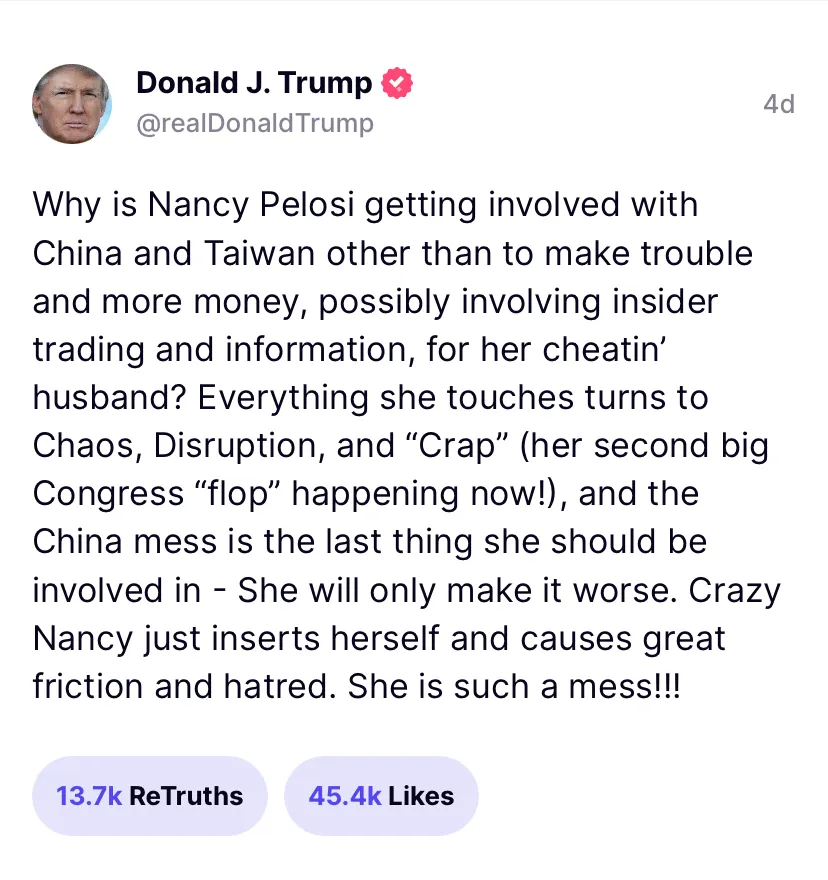 The most recent chapter in the Pelosi/Taiwan saga has me perplexed. She’s meeting with Taiwan’s largest semiconductor manufacturer, which confirms A LOT of Trump narratives. Most important of which, is that she is openly engaging in insider trading. It’s like she’s not even trying to hide it.