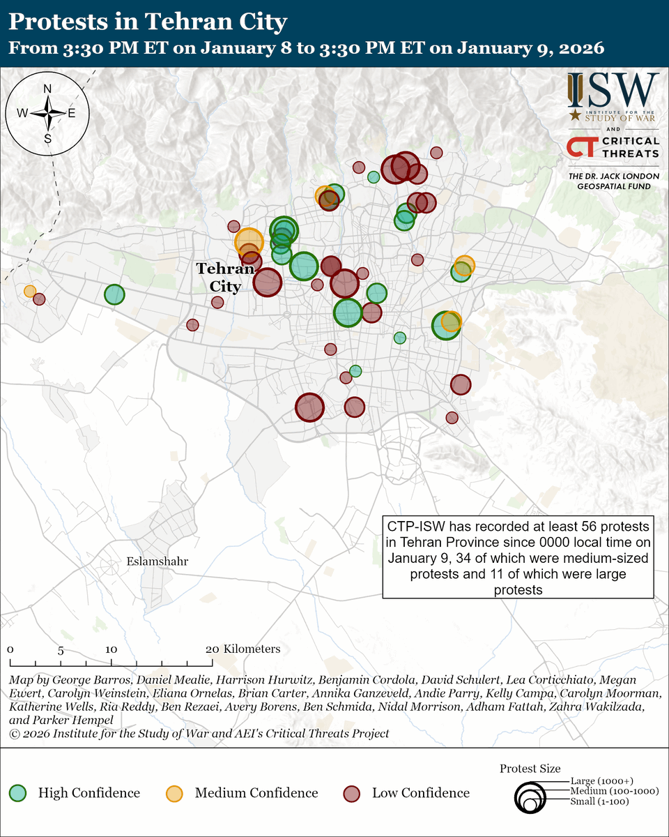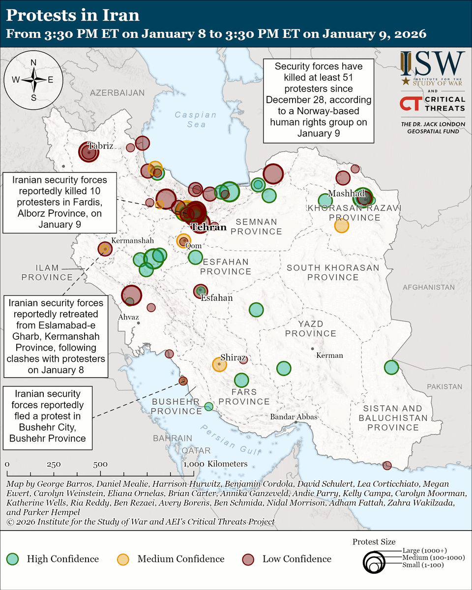 The Iranian regime has sustained its nationwide internet shutdown, likely to disrupt protest coordination and obscure the scale of its crackdown.[1] Reports indicate that Iran's internet connectivity has remained at approximately one percent of normal levels since 3:00 PM ET on January 8.[2] The Iranian regime has historically imposed internet blackouts during periods of major unrest, including during the 2019 protests, when the regime killed around 1,500 protesters in less than two weeks.[3] The internet shutdown reflects the regime's concerns about the momentum of the protests and international scrutiny on its repression. The regime likely shut down the internet to disrupt protesters’ ability to communicate with one another and organize protests. The regime has also expanded its use of lethal force to crack down on protests beyond western and central Iran, and the internet shutdown is likely meant to hide the extent and brutality of the regime's crackdown across Iran.[4] A Norway-based Iranian human rights organization reported on January 9 that Iranian security forces have killed at least 51 protesters, including nine minors, and wounded hundreds of others since December 28.[5] Anti-regime media reported on January 9 that Iranian security forces killed at least 10 protesters during demonstrations in Fardis, Alborz Province.[6]