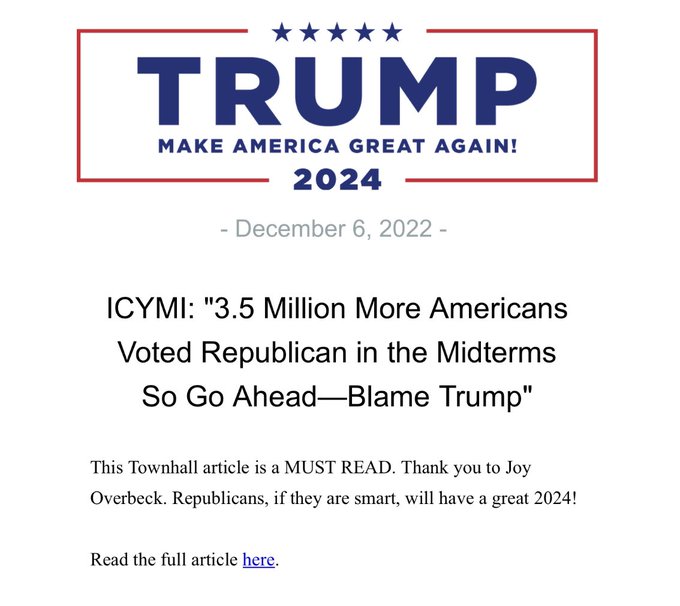 “The Trump magic is clear in the Midterm numbers - 92% of Trump’s endorsees won their primaries, as did 86% of his general election picks. The nay-sayers claiming his 2020 coattails were toxic in 2022 - even though he had no coattails because he wasn’t on the ballot – are simply wrong. In total, Trump’s candidates won 224 of 241 primary races and 208 of 254 general-election ones, according to the Trump-hating Washington Post. People obviously like to vote for the candidates Trump likes. Rather than waning, his influence is on the rise.”