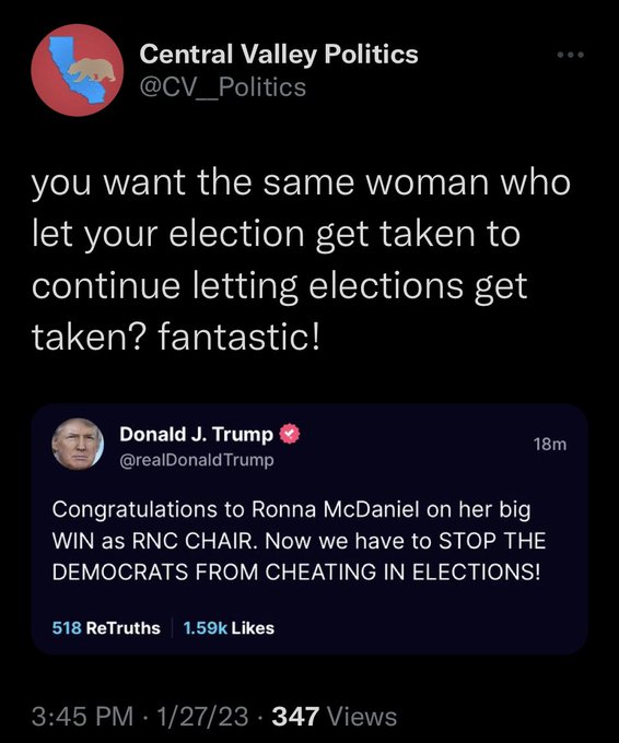 Congratulations to Ronna McDaniel on her big WIN as RNC CHAIR. Now we have to STOP THE DEMOCRATS FROM CHEATING IN ELECTIONS!