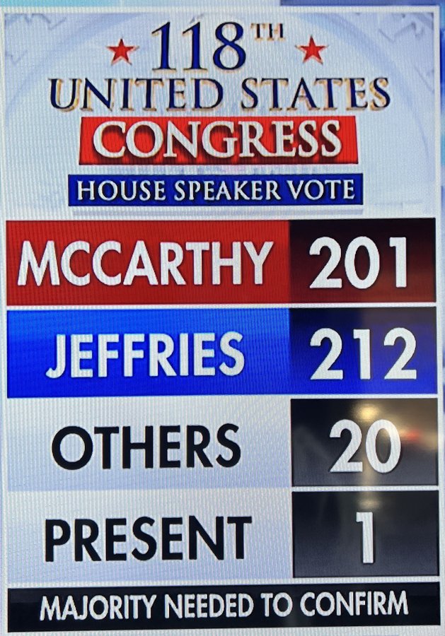 Things get worse for McCarthy. 20 GOPers vote against McCarthy in favor of Donalds. But GOP IN Rep Spartz votes present. So that’s 21 against McCarthy. His support is slipping