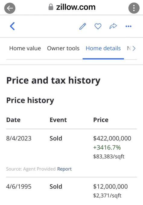 According to Zillow, the residence was sold on August 4th 2023 for $422,000,000.