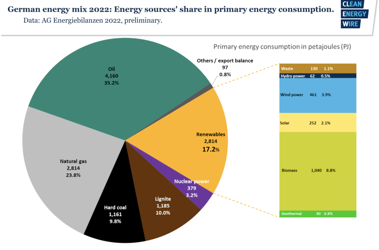 And meanwhile, with Germany’s massive investments in wind and solar electricity generation, are those sources actually making any major inroads in the overall market for primary energy in the country? Here is an extremely revealing chart, again from Clean Energy Wire, with data from 2022: