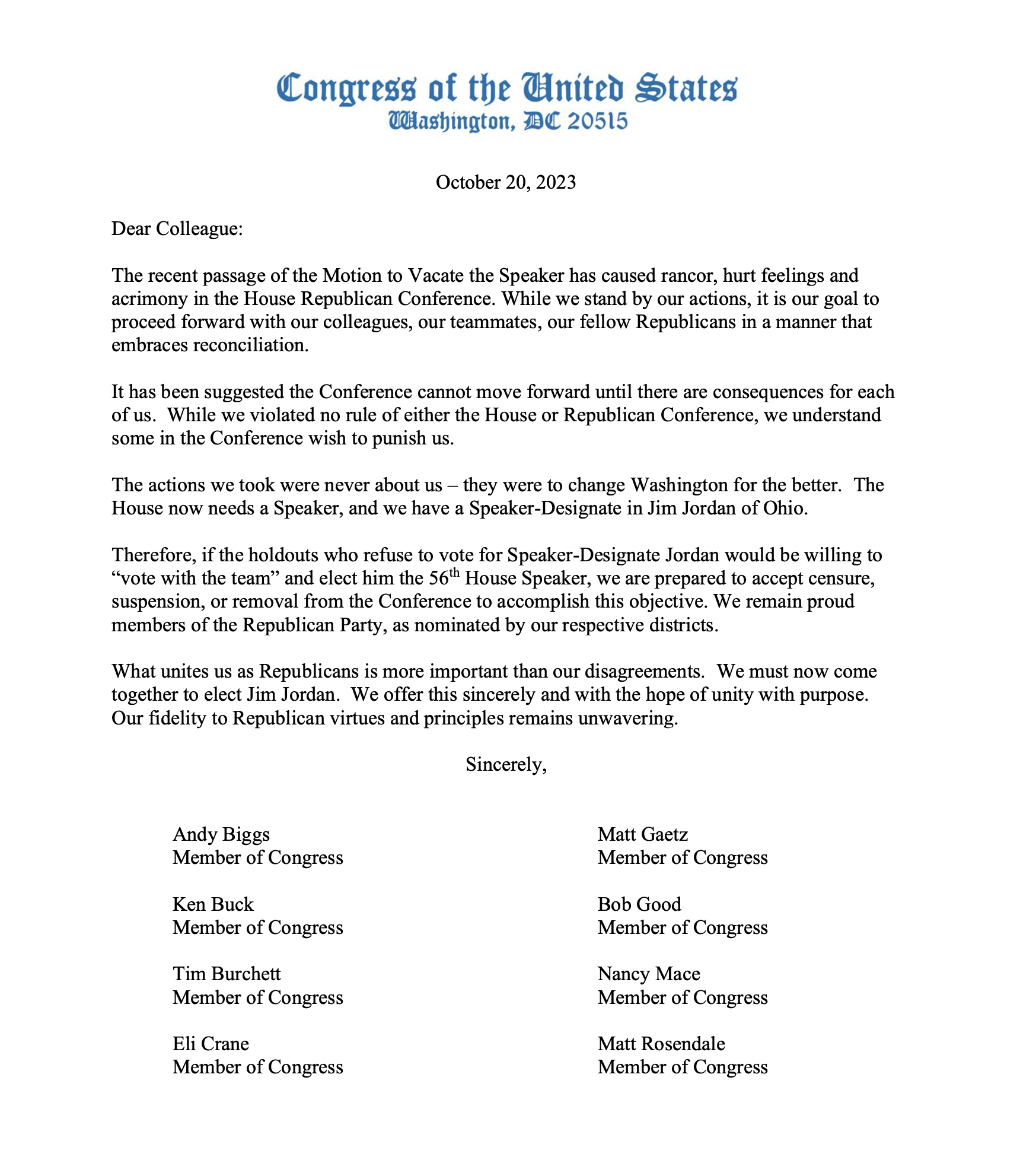“If the holdouts who refuse to vote for Speaker-Designate Jim Jordan would be willing to 'vote with the team' and elect him the 56th House Speaker, we are prepared to accept censure, suspension, or removal from the Conference to accomplish this objective.”