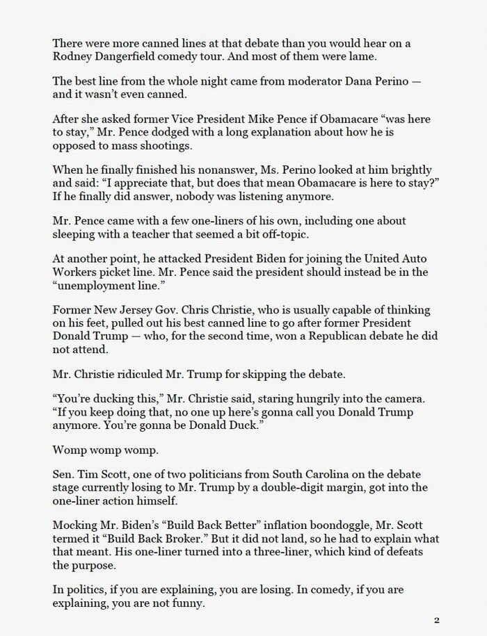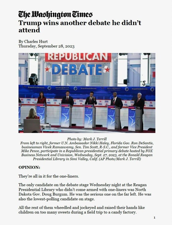 I’m up 56 Points, so the Debates would seem to be a complete waste of time. I’m also up 10 on Crooked Joe! What is the RNC doing? They should be fighting against Election Interference & the Pennsylvania Voter Registration Scam. The Debates should be ENDED, BAD for the Republican Party! I was in Michigan last night with Autoworkers & others. Watched Debate = REPORT CARD: Doug Burgum did a very good job, solid & smart! Sloppy Chris Christie was a DISASTER, A TRUMP DERANGED LUNATIC! Nikki “Birdbrain” Haley was exposed for her caustic DISLOYALTY & LIES about the Republican Party, and me. Doesn’t have what it takes, NEVER DID! Lyin’ Mike Pence has lost a lot of his energy. Very flat, needs me badly! Actually, quite sad to watch, but he’ll get better. Too much J-6! Tim Scott stepped it up. Wonderful guy. Looking forward to getting his Endorsement! Vivek said I was a great President. Thank you. Good Job! Ron DeSanctimonious had a bad night. He can feel the end is near. Dropping like a rock!