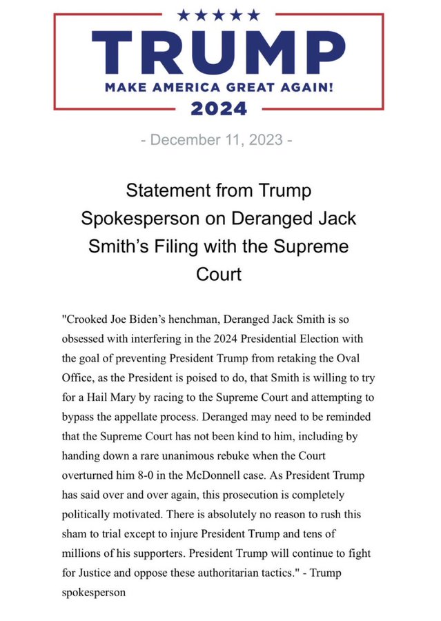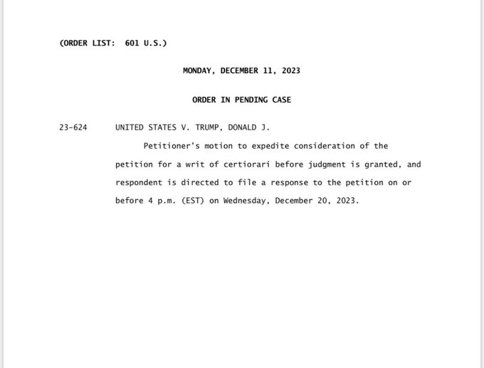 FLASH: Supreme Court agrees to Special Counsel Jack Smith’s request to take up Trump presidential immunity claim. Trump must respond by Dec 20 twitter.com/macfarlanenews…
