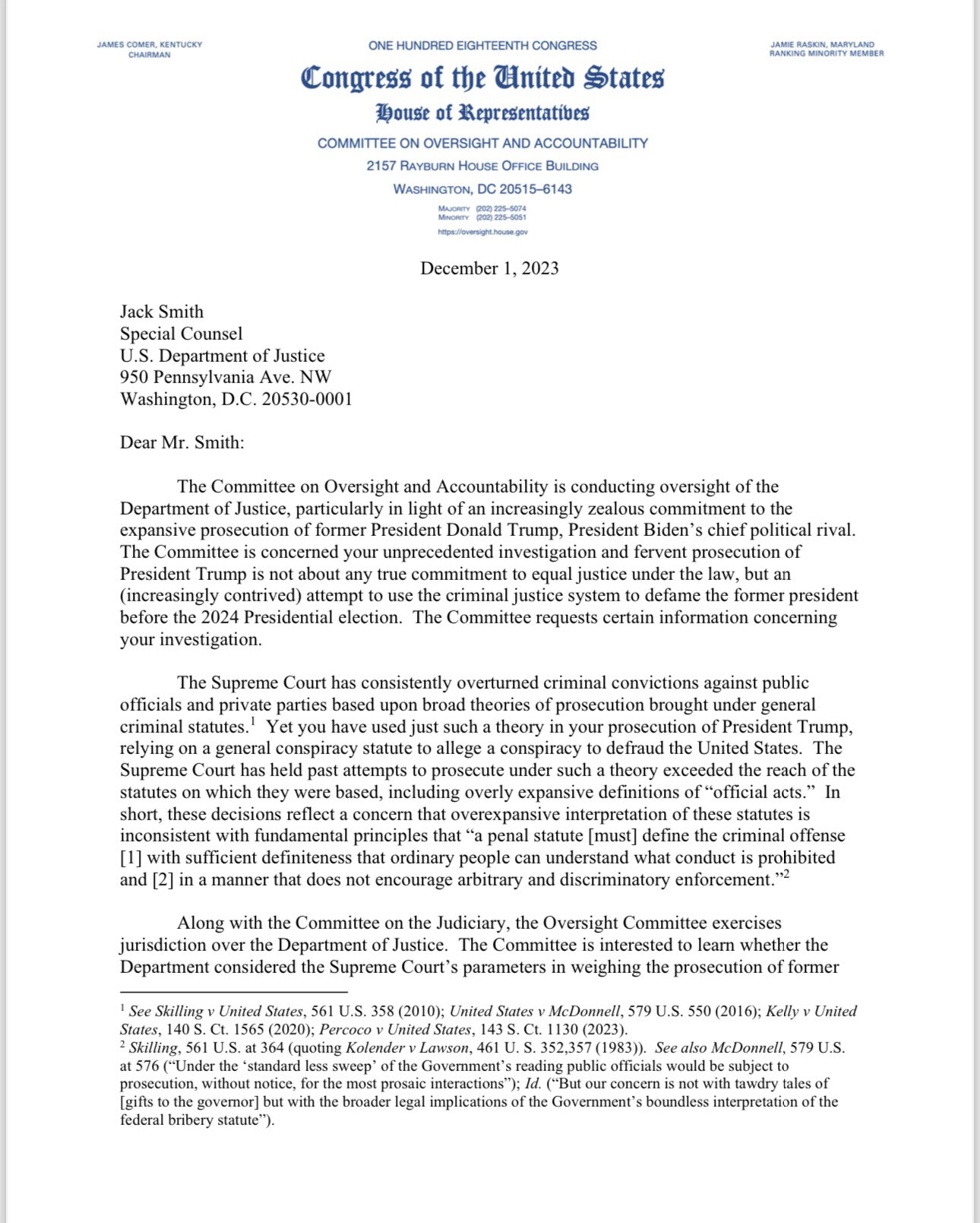 demand info about whether Smith properly followed Supreme Court precedent when he indicted Trump under the general conspiracy statute They want *all communication* between Jack Smith & DOJ about decision to indict Trump (!!) and gives a deadline of December 15 This is the fight the American people want from the Republican Party - GOP controls the House so use the power We the People gave you!
