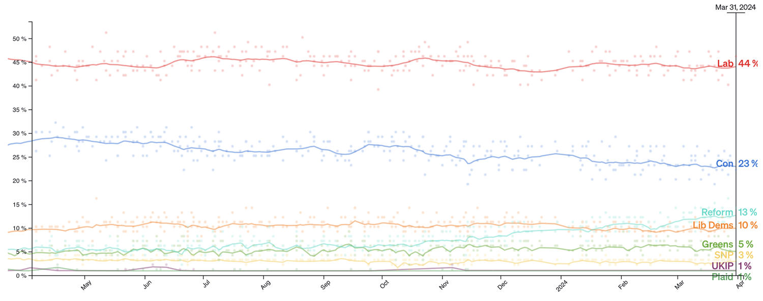 There are surely other reasons for the current unpopularity of the Conservative government. However, this issue clearly ranks at or near the top. Here is a chart of polling for the next election from Politico’s UK branch: