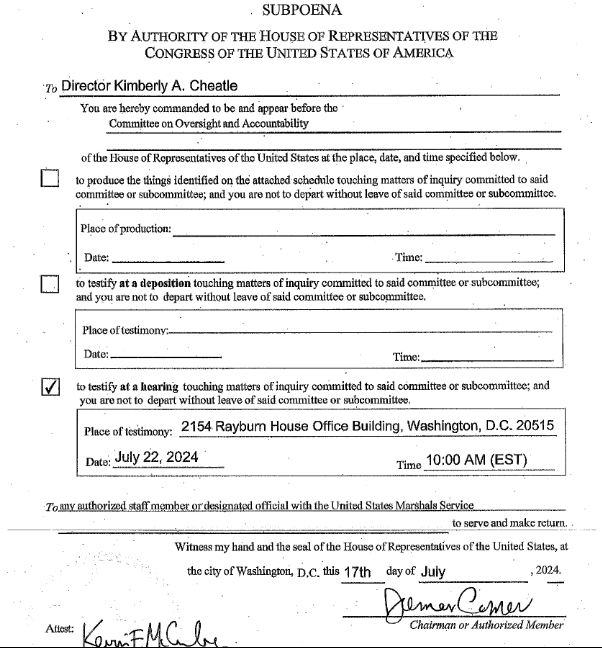 House oversight committee issued a supoena for the SS Director. I had heard earlier today Garland was trying to prevent her from testifying.