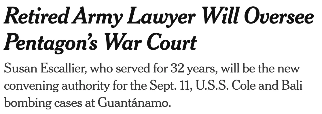 In a memo signed this week, Mr. Austin said that Susan K. Escallier, the former Army lawyer, would become the convening authority for the Office of Military Commissions on Oct. 8. The current convening authority, Jeffrey D. Wood, will voluntarily leave the job on that date, Mr. Austin’s memo said.