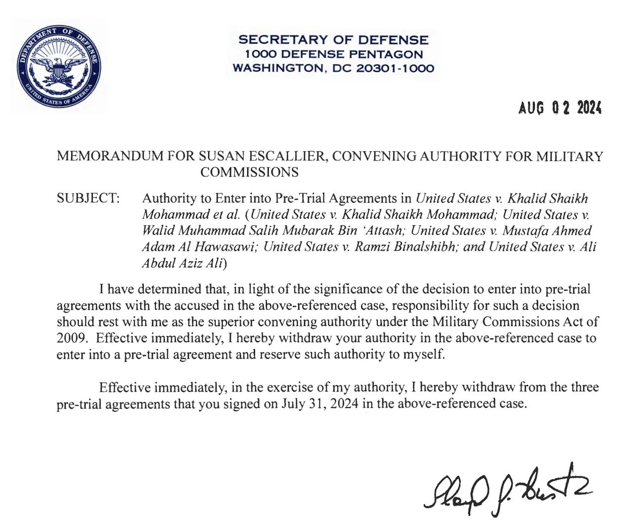 Sec Def Lloyd Austin abruptly reverses the plea agreement, apparently caving to the pressure (ie: the express mandate) of the American public in order to ensure the door to true justice (ie: the truth) is not closed on this seismic event in world history. ....