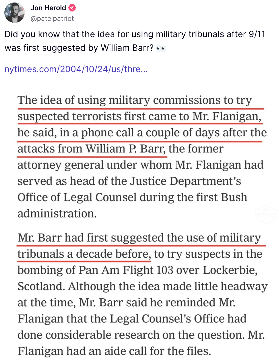 Oh, and as Jon Herold was digging on this particular subject (the tribunals of it all,) he unearthed this rather juicy morsel regarding the infamous (to both sides of the Mind War,) Bill Barr.