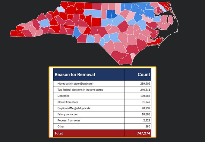 BREAKING: The North Carolina Election Board just revealed that they have removed 750,000 names from the voter rolls, including 130,000 dead people and 290,000 registrations that were duplicates
