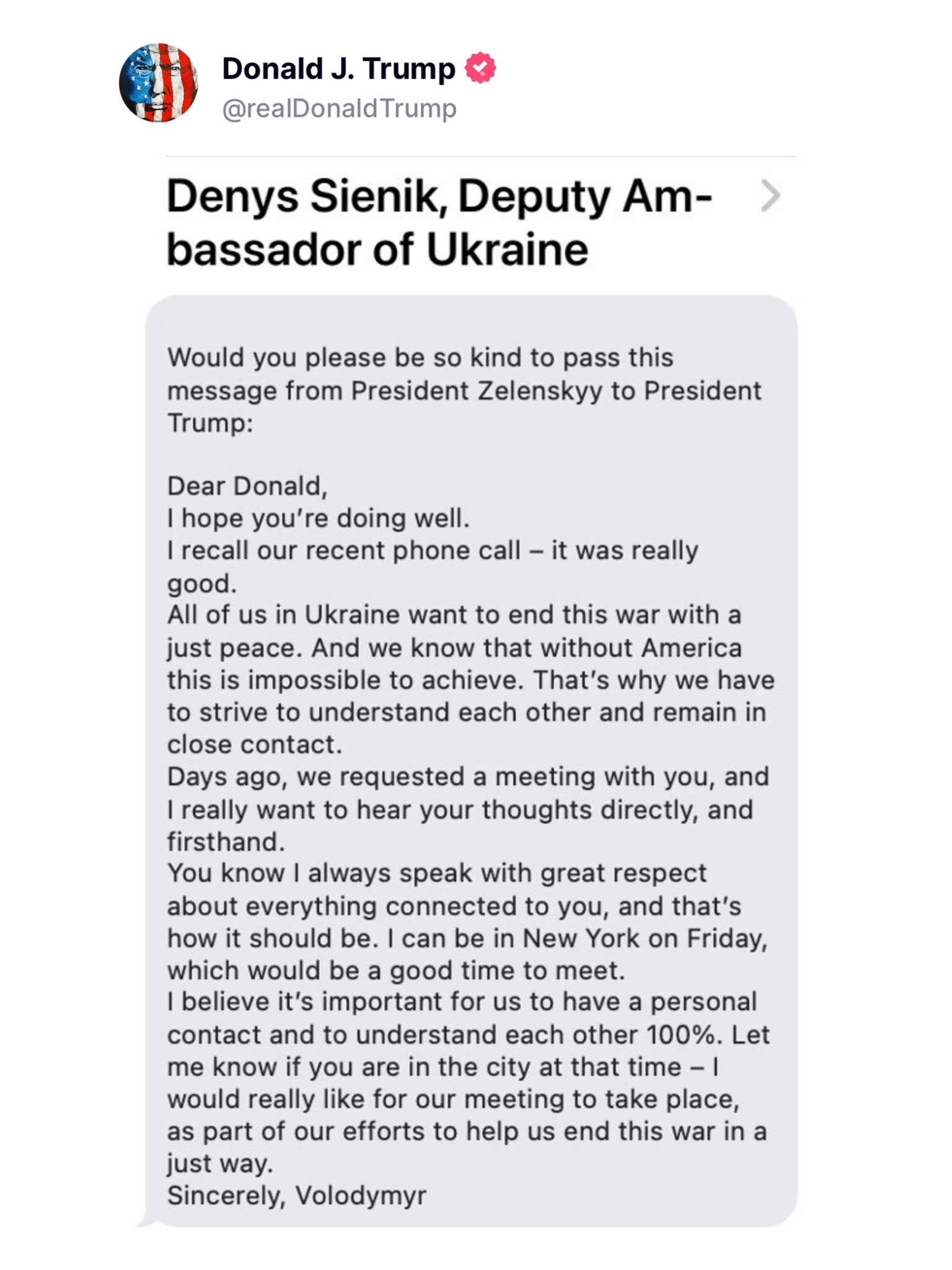 Trump meeting with Zelensky in Trump Tower tomorrow morning at 9:45 am.