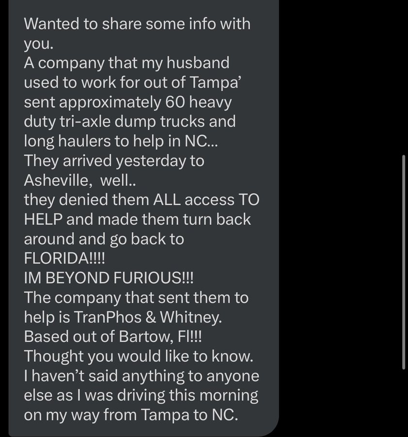 A follower of mine says a company her husband worked for sent 60 trucks to help in North Carolina and all of them were DENIED ACCESS to help, and they were ordered to turn around and BLOCKED from entering in a BLOCKADE.