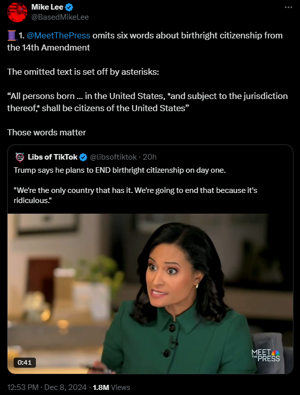 "In this instance, @MeetThePress seems to try to render a debatable matter beyond debate by selectively omitting key words from the Constitution, making it appear incorrectly that the Fourteenth Amendment proscribes any and all restrictions on birthright citizenship."