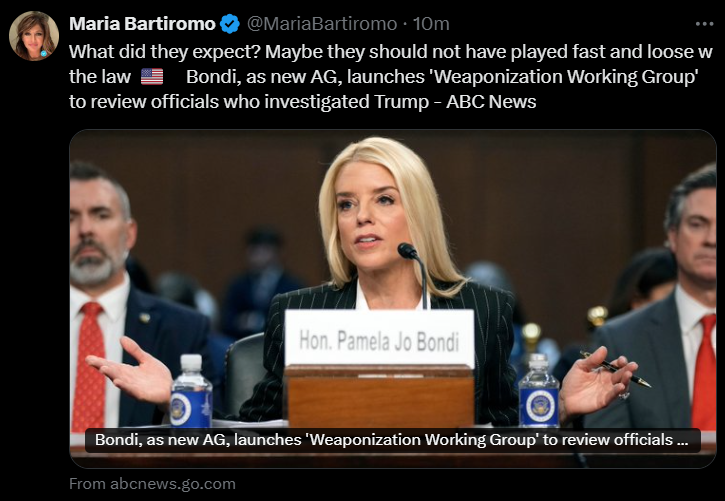 Bondi, in an interview with Fox News last year, vowed to prosecute "bad" prosecutors at the DOJ and to investigate those "hiding in the shadows" of the so-called "deep state."