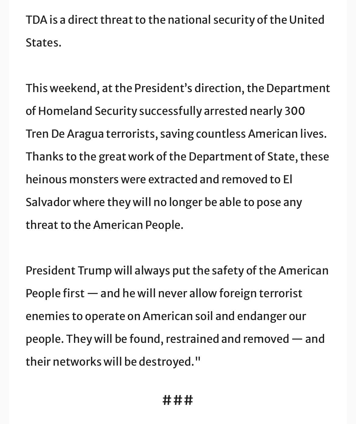In a mid-morning press release, the White House confirms it completed the deportation flights which a corrupt judge illegally attempted to prevent. pic.twitter.com/3HxpjLWUFa— Sean Davis (@seanmdav) March 16, 2025