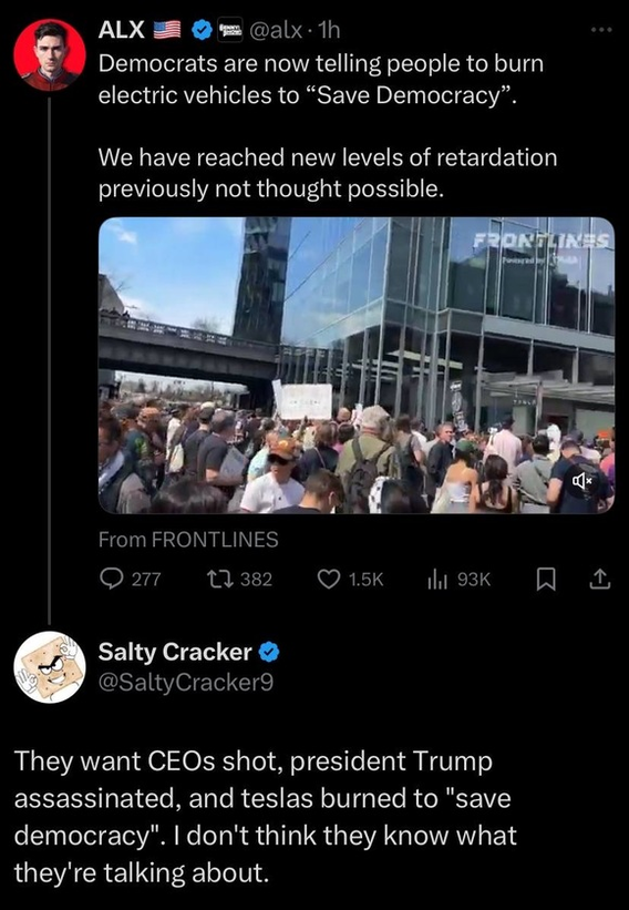 The left is cheering, saying if they knock down Tesla, they will knock down Musk and that will knock down Trump, which will knock down the Republicans. That's their plan.