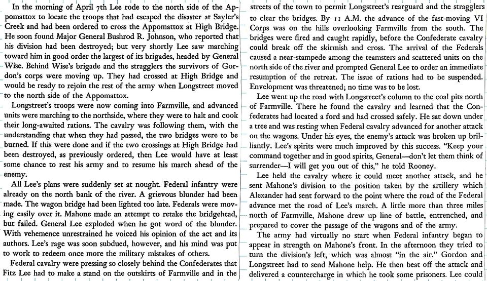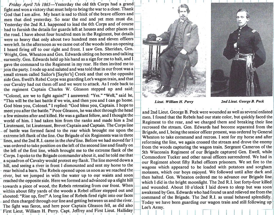 Diary of 5th Sergeant Alexander G. Downing: Friday, April 7, 1865 (“At four P.M. we heard heavy firing across the river from Humphreys, who had gone towards the Lynchburg stage road and had there struck the whole of Lee’s army”)