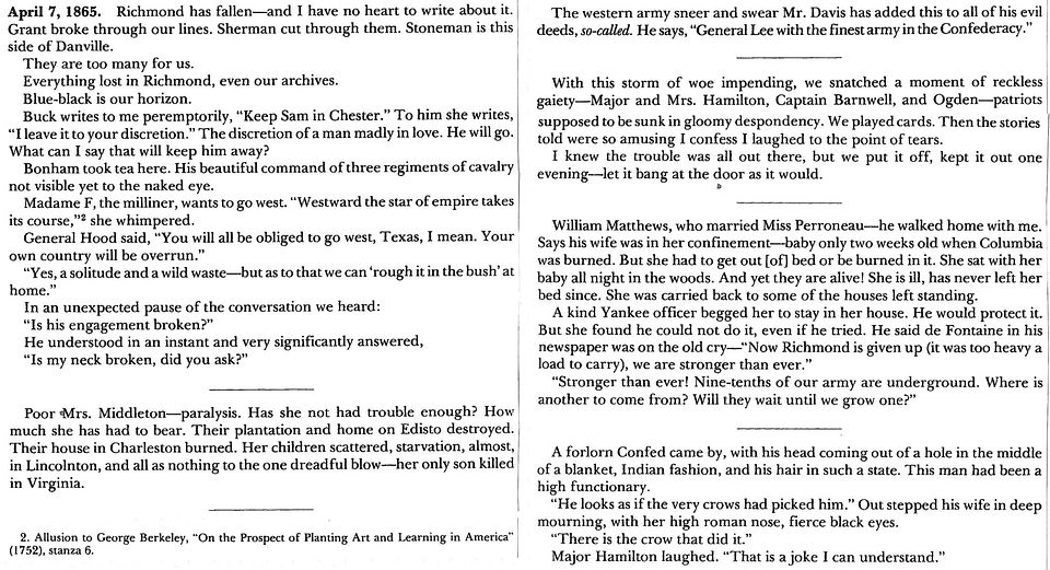 Diary of John Beauchamp Jones: April 6, 1865 (“The military authorities are still reticent regarding the fate of those remaining in Richmond. We are at their mercy, and prepared for our fate.”)