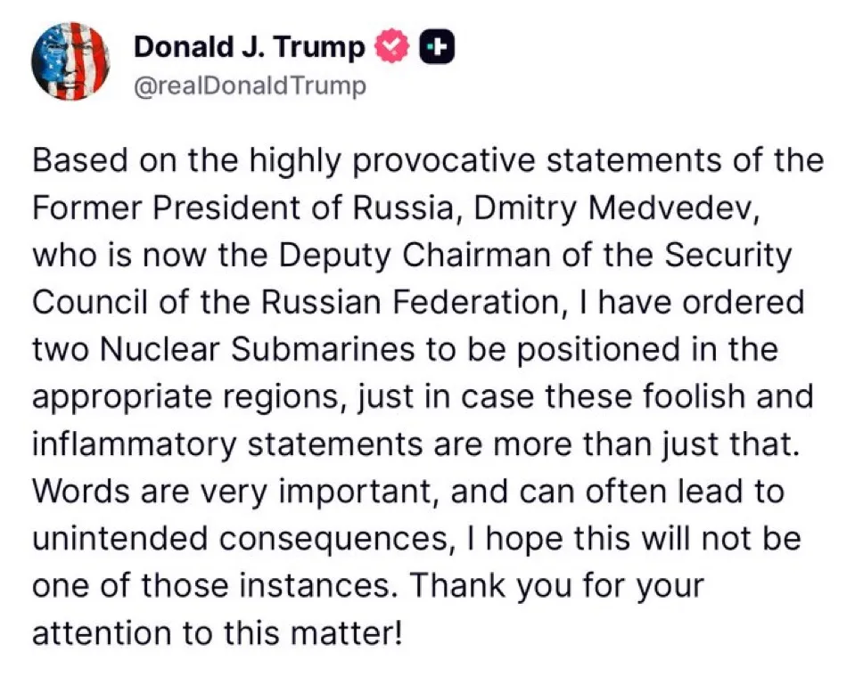 Based on the highly provocative statements of the Former President of Russia, Dmitry Medvedev, who is now the Deputy Chairman of the Security Council of the Russian Federation, I have ordered two Nuclear Submarines to be positioned in the appropriate regions, just in case these foolish and inflammatory statements are more than just that. Words are very important, and can often lead to unintended consequences, I hope this will not be one of those instances. Thank you for your attention to this matter!