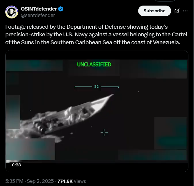 May the entire Western Hemisphere be on notice: If you try to smuggle drugs into America to kill our people, America may kill you first. https://t.co/1vXeM3U0Xz— Charlie Kirk (@charliekirk11) September 2, 2025