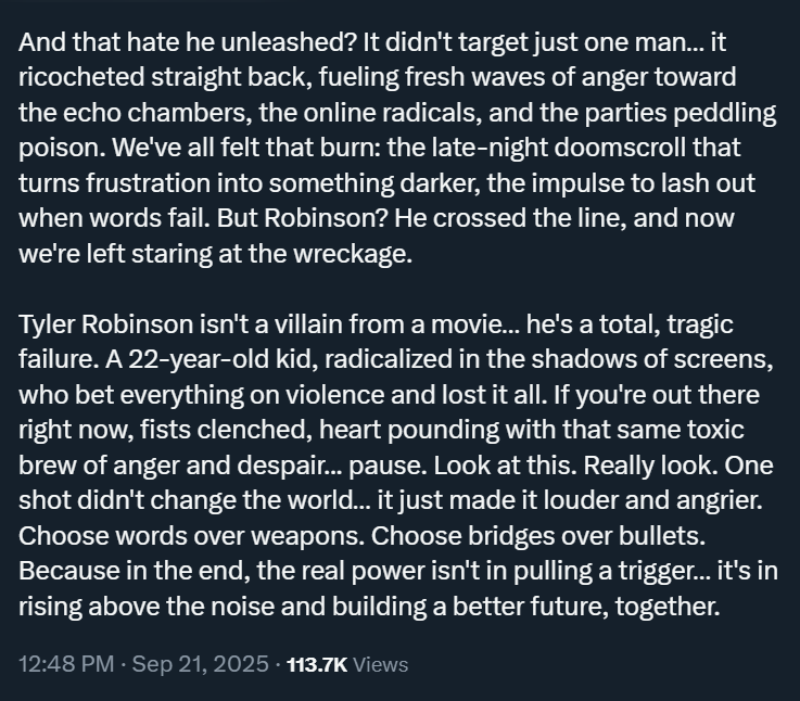 In the General/Chat forum, on a thread titled Q ~ Trust Trump's Plan ~ 09/01/2025 Vol.511, Q Day 2866, Bigg Red wrote: Re: The police had reports of a man with a scope/rifle but they all bunched up to walk in the doorway?