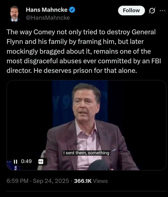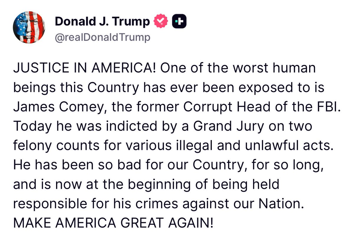 “JUSTICE IN AMERICA! One of the worst human beings this Country has ever been exposed to is James Comey, the former Corrupt Head of the FBI. Today he was indicted by a Grand Jury on two felony counts for various illegal and unlawful acts. He has been so bad for our Country, for so long, and is now at the beginning of being held responsible for his crimes against our Nation. MAKE AMERICA GREAT AGAIN!”https://x.com/bennyjohnson/status/1971356296931659946?t=Rcuaro78LrsR1qzQq2lPTg&s=19
