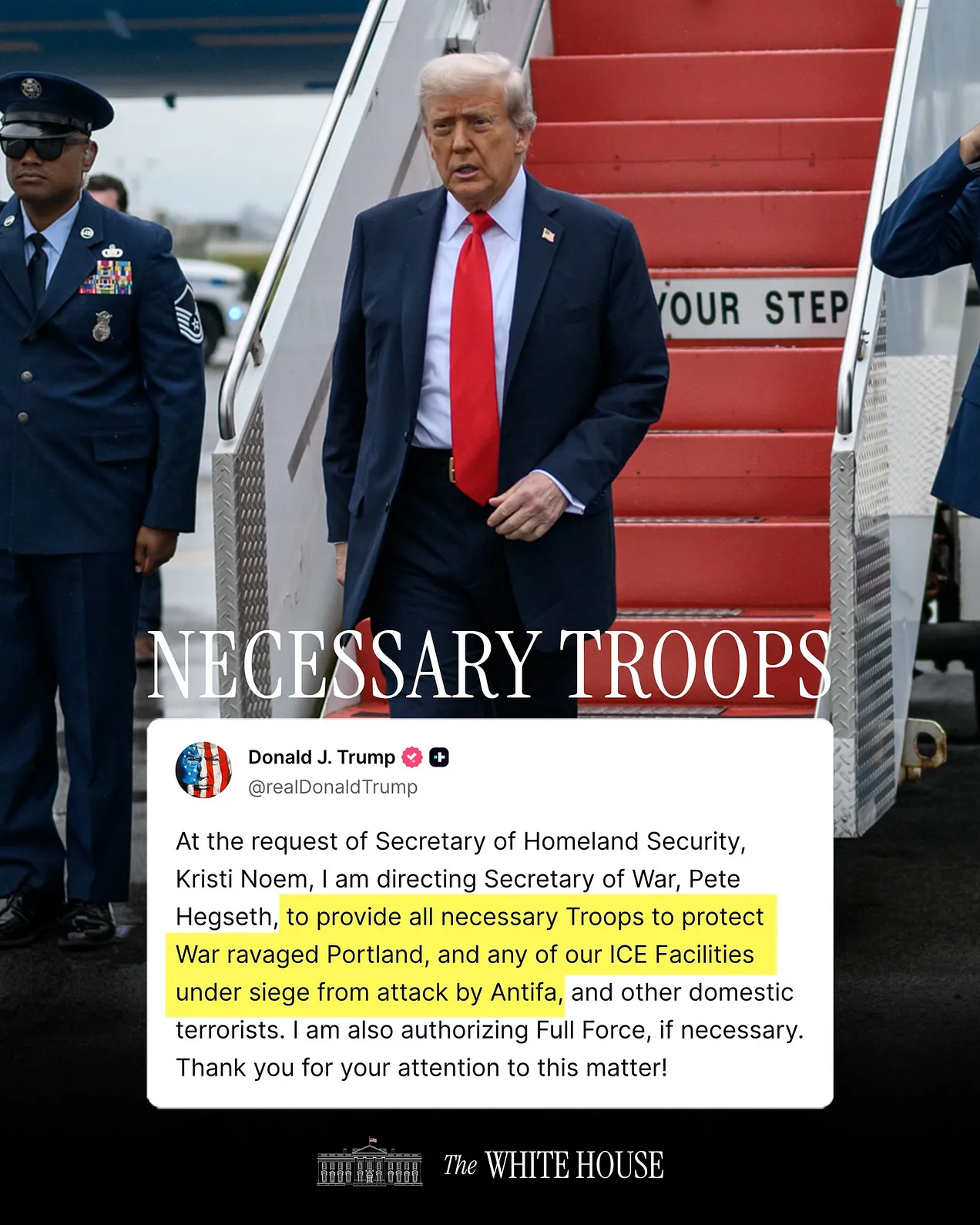 “At the request of Secretary of Homeland Security, Kristi Noem, I am directing Secretary of War, Pete Hegseth, to provide all necessary Troops to protect War ravaged Portland, and any of our ICE Facilities under siege from attack by Antifa, and other domestic terrorists,” Trump said on Truth Social.