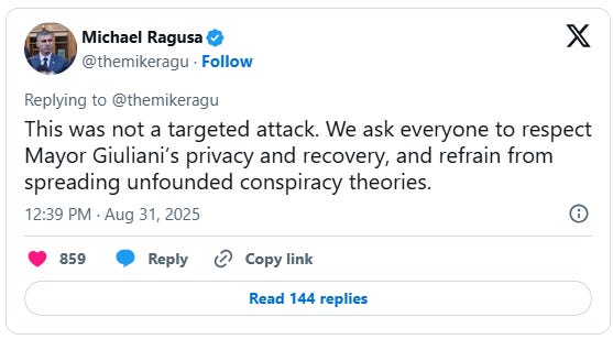 “On the evening of August 30, 2025, in New Hampshire, Mayor Giuliani was involved in a motor vehicle accident. Prior to the incident, he was flagged down by a woman who was the victim of a domestic violence incident. Mayor Giuliani immediately rendered assistance and contacted 911. He remained on scene until responding officers arrived to ensure her safety,” Ragusa said.