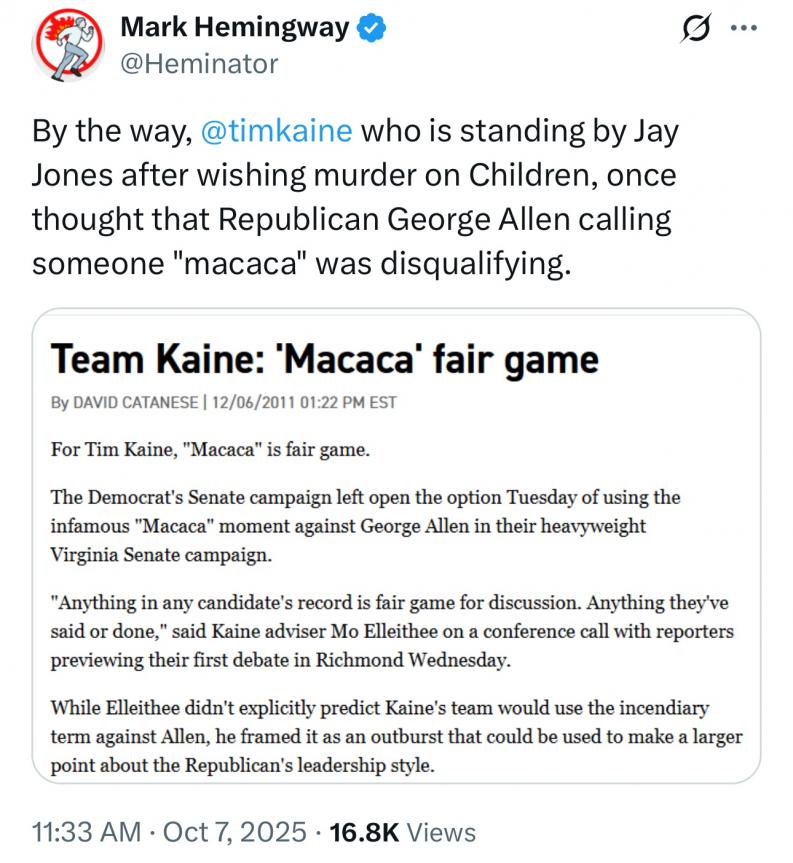 But Jay Jones need only apologize and minimize his intent in calling for murder of his opponent with wife and children - and it is not even necessary to withdraw from the race. The double standard is intolerable and the GOP has got to be stronger to stand up to this outrage.