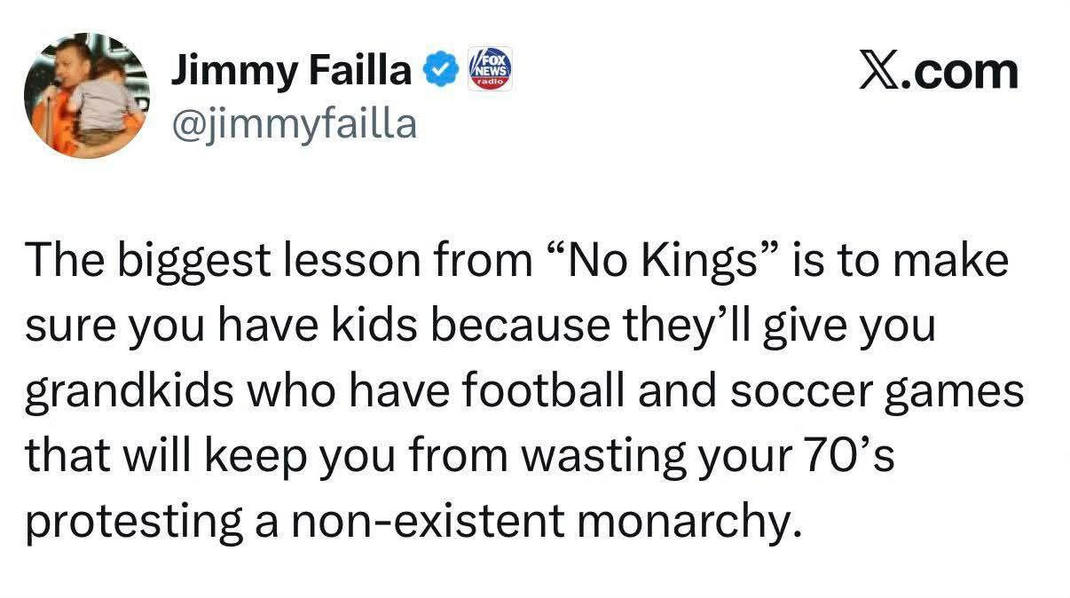 In a bizarre display of intergenerational opportunism, Medicare Supplemental Insurance salesman Jerry Jenkins has been raking in the dough by targeting the unlikeliest of demographics: Baby Boomers participating in the No Kings Day protests against Trump's alleged authoritarianism. Yes, you read that right-Boomers, armed with inflatable unicorns and "America Has No Kings" signs, are storming the streets, and Jenkins is right behind them, clipboard in hand.
