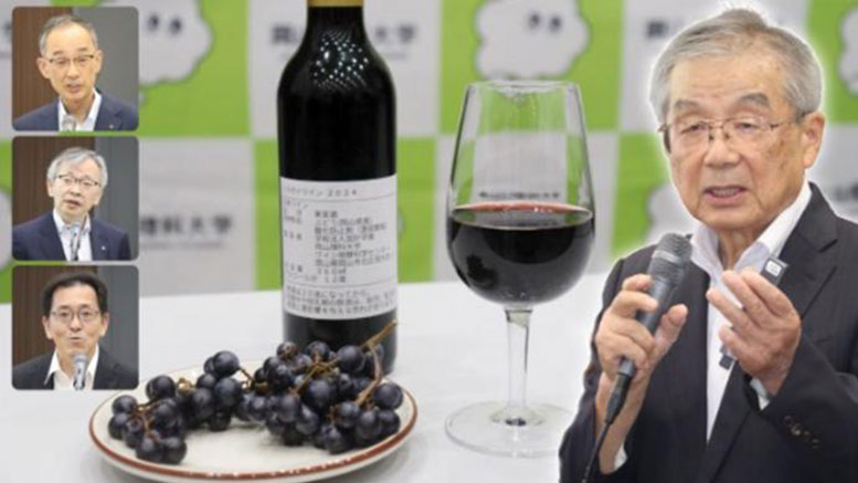 The fruit and wine of the newly developed grape “Muscat Shiragai,” presented at a press conference by Professor Emeritus Takuji Hoshino (right). From left to right above: Kurashiki Deputy Mayor Kenji Komatsu, OUS President Hiroyuki Hirano, and Funao Winery CEO Kenichiro Miyake. Credit: Okayama University of Science