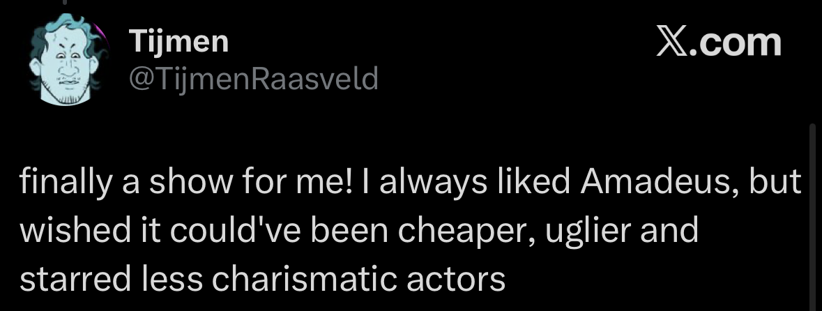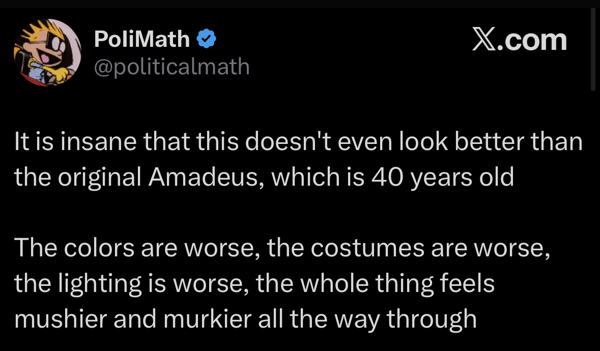 They replaced the inimitable Tom Hulce with a half-Japanese British citizen name Will Sharpe, because that totally makes sense for the Austrian Mozart?