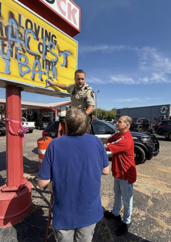 Meanwhile, police helped Tire Dock clean their sign: