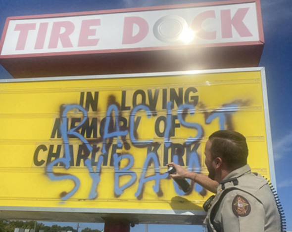 Megan Bucheger wrote "Racist SYBAU" on a sign at Tire Dock in Logansville, Georgia, which said "In loving memory of Charlie Kirk."