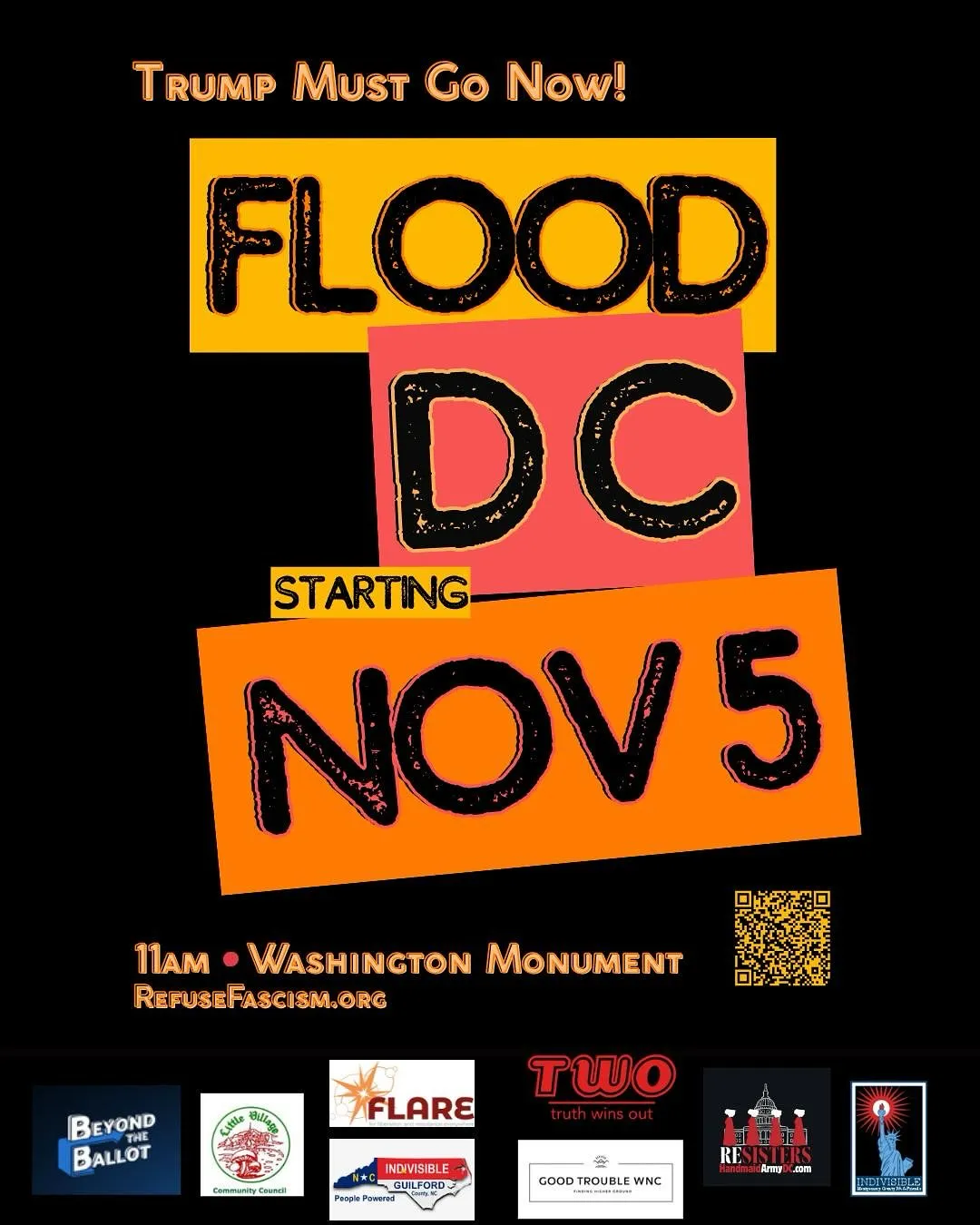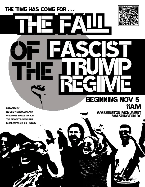 “Beginning November 5, the one-year anniversary of Trump’s election, flood DC in nonviolent protest. Surround the White House. Surround the Capitol. Surround the illegitimate fascist-packed Supreme Court. Come back again and again. Across the country, refuse to comply. Every person of conscience, millions of us together, grind the machinery of the fascist regime to a halt.”