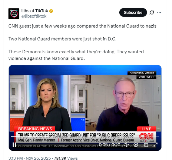 BREAKING: FBI will investigate National Guard shooting as a potential act of terrorism, suspect initially identified as Afghan national, per NBC— Jack Posobiec (@JackPosobiec) November 26, 2025