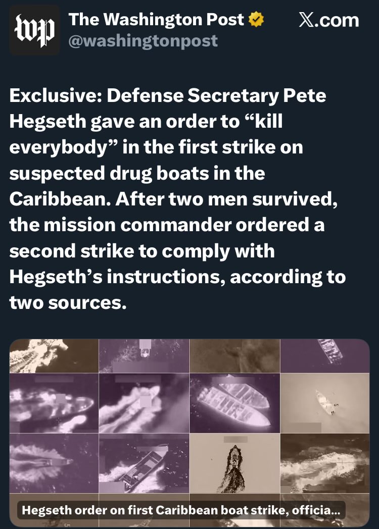 “Timeline of a deep state hit:The WaPo helpfully provides two anonymous sources to compound the dastardly illegal order delivered by an incompetent Secretary of War...A) a JSOC kill strike is ordered on an authorized target. Not a capture strike, a kill strike - President Obama was quite fond of them btw - 500+ to his name, including Americans.