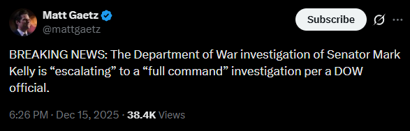 BREAKING: “The Office of the Secretary of War, in conjunction with the Department of War’s Office of the General Counsel, is escalating the preliminary review of Captain Mark Kelly, USN (Ret), to an official Command Investigation. Retired Captain Kelly is currently under investigation for serious allegations of misconduct. Further official comments will be limited to preserve the integrity of the proceedings” - Department of War official
