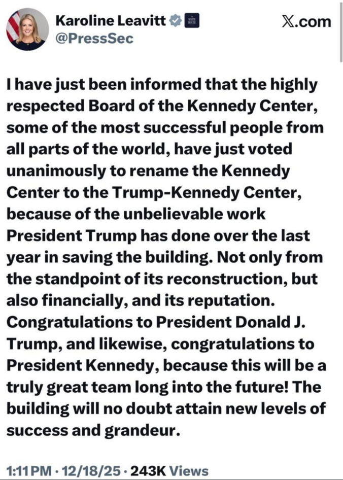 I have just been informed that the highly respected Board of the Kennedy Center, some of the most successful people from all parts of the world, have just voted unanimously to rename the Kennedy Center to the Trump-Kennedy Center , because of the unbelievable work President Trump has done over the last year in saving the building. Not only from the standpoint of its reconstruction, but also financially, and its reputation. Congratulations to President Donald J. Trump, and likewise, congratulations to President Kennedy, because this will be a truly great team long into the future! The building will no doubt attain new levels of success and grandeur.